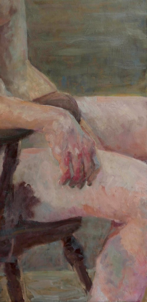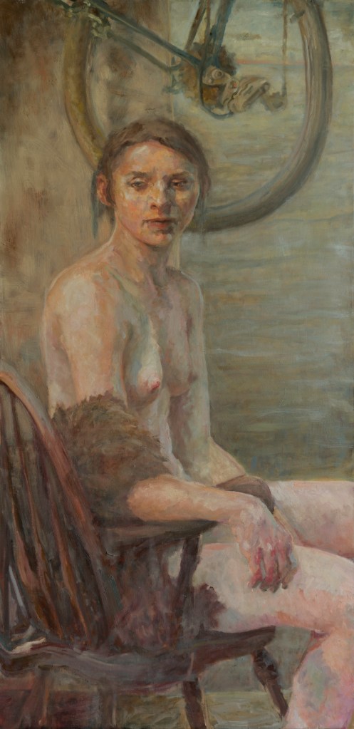 Look here: you have a piece of a bicycle, a wooden chair, a fur coat (?) and a naked woman together! Anyone who paints knows, a more complex composition has the downside of always highlighting the creator’s effort, a certain staging, a suggestion too much…. but that rule does not apply here, my friends.