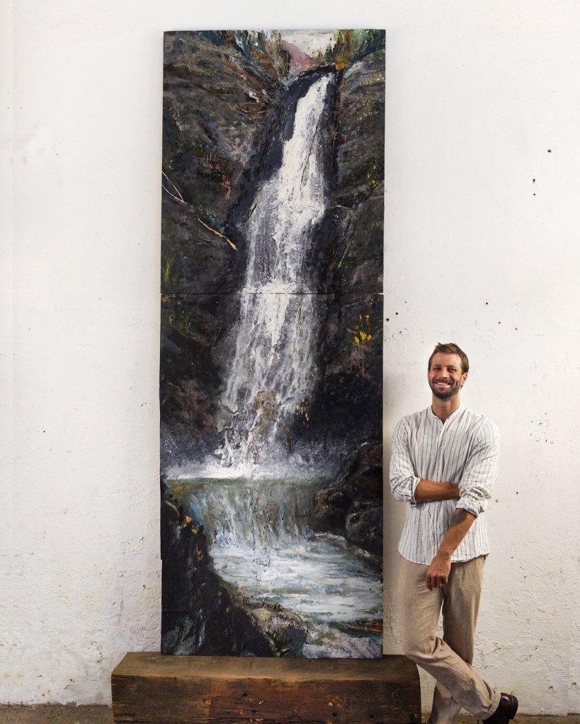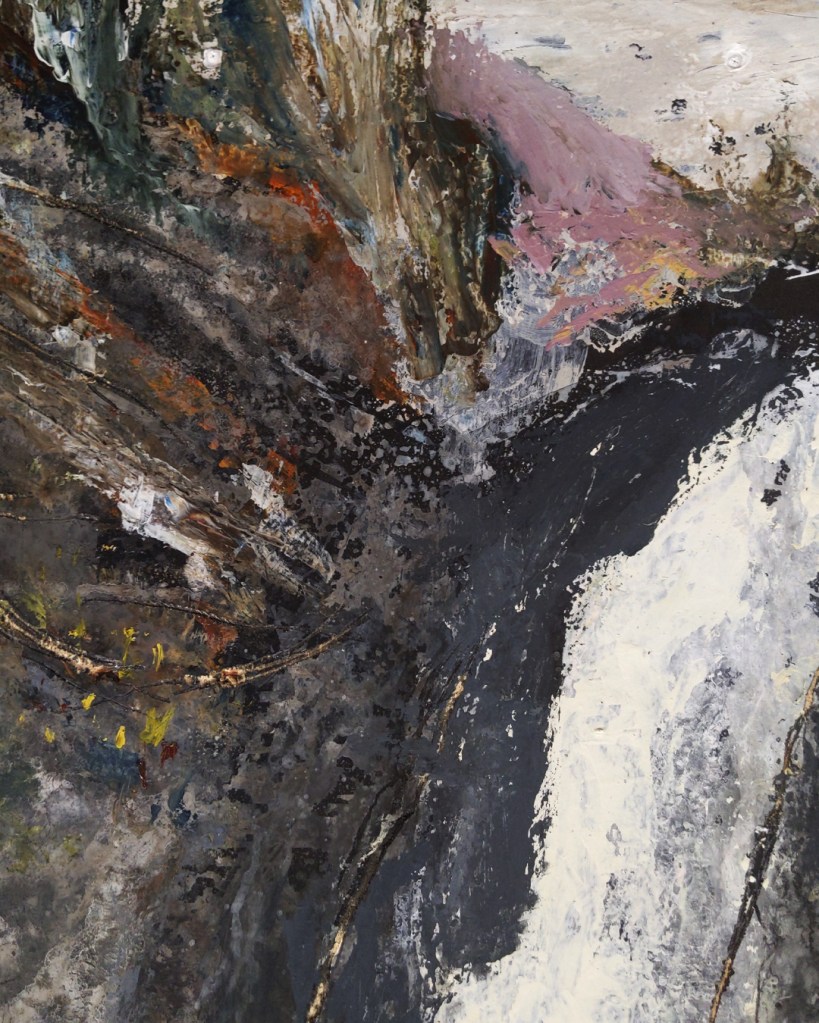 This painting makes me feel like Bruno was in search, and succeeded even just a little more, in finding his true Self… by becoming no one, becoming nature. I say this because of how the portrait can be seen within the work: A character once rendered so thickly and with detail that I can almost see the portrait behind the waterfall and the nature surrounding. The figure is still trying to pull through and be seen, but loses itself to the grandiosity of the water and stone. To finally see the beauty that is out there is within as well. Yes, another epic painting by Bruno. Well done.