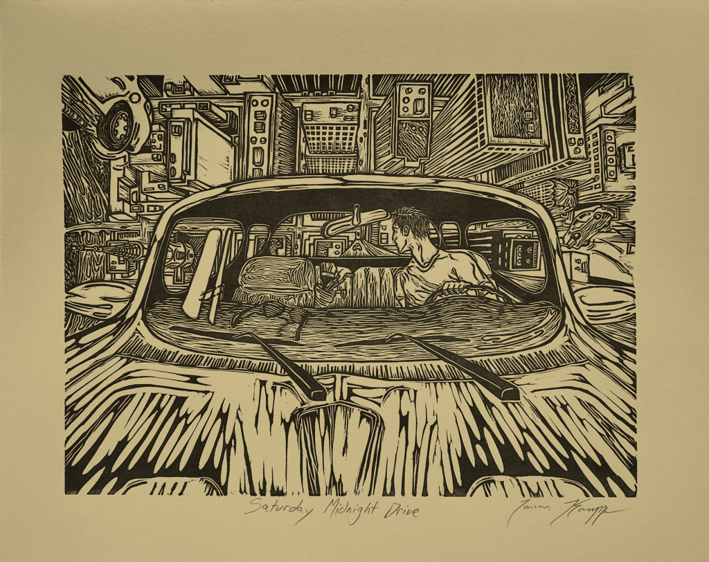 Man… I spent a lot of time thinking and mulling over this piece since I created it, and I don’t want to write this whole overintellectualized “bigger than it truly is” artwork… a small linocut I created back in the day. But, I can’t help but try to bring up some of its history and what went into its making, because when you understand some of the context… it can at least become a little more interesting.