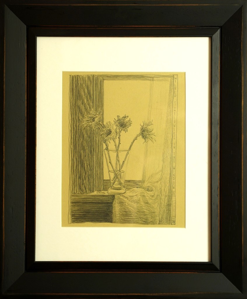 There is a rich reward when you take time to examine this work. You feel the sunlight dappled through a sheer curtain that loops you back into the central focus of the picture —.the misanthropic flower, which is turned opposite from the others (left). I know that one is onto something special. That flower doesn’t move toward the light, which flowers are wont to do, but embraces the darkness which is very much alive in all of us. I “I am understated and patient for recognition.” That’s what this drawing says.
